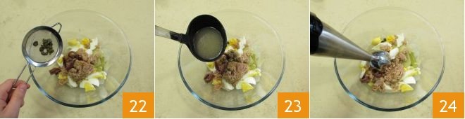 along with the anchovies in oil and the desalted capers (to desalt them, place them under fresh running water) 22; lastly, add a little broth 23. Use an immersion blender (a classic mixer will also do) and add a little more broth if needed 24.