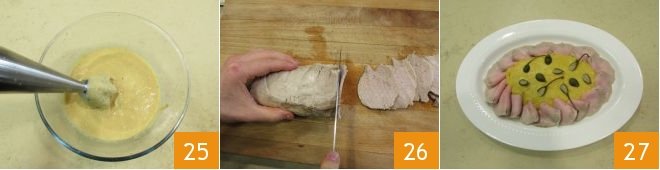 Blend into a smooth cream with whatever consistency you prefer 25. By now the meat should have cooled down. Slice it thinly with a smooth bladed knife 26. Arrange the slices on a serving dish and pour the cream over them. Lastly, decorate with the caper fruits, some whole and some sliced: your vitello tonnato is ready 27.