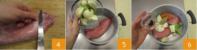 Now clean the meat: remove any cartilage and fat filaments 4. Place the eye of round, chopped vegetables 5, the laurel leaf, 2-3 cloves and the black peppercorns 6 in a large pan.