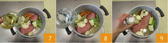 and then the oil 10. Switch on the stove and bring to the boil, then remove the foam as soon as it forms on the surface 11. Put the lid on and lower the flame slightly before leaving to cook for around 40-45 minutes; remember that every lb of meat requires a cooking time of around 30 minutes. The important thing is that the temperature in the middle of the meat cut never exceeds 150°F (65°C): use a cooking thermometer to check this 12.