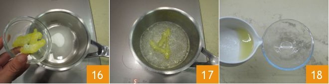 Add the lemon zest with a knife 16 and bring to a boil 17. In another bowl, pour the lemon juice 18.