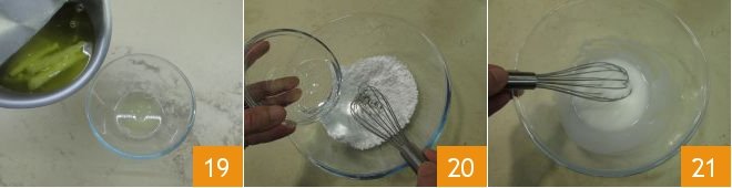 When the syrup begins to boil, pour it unfiltered on the lemon juice while hot 19. Now make the icing. In another bowl pour the powdered sugar, water 20 and stir with a whisk until all the lumps dissolve 21. The mix should be rather watery.