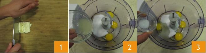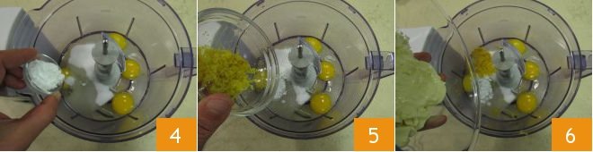 To prepare the lemon and white chocolate pound cake, first make sure all the ingredients are at room temperature of 75° F (24-25° C). Grate the lemon rind and squeez out the juice, then cut the chocolate into cubes 1. In a large mixer equipped with blades, pour in the eggs, sugar, lemon juice 2, salt 3,