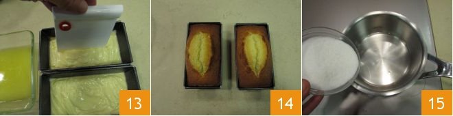 insert it in the center of the pound cake 13, move it gently and pull it out to create a cut. Do the same for the other. In this way it will rise evenly as it bakes. Bake the pound cakes in a static oven at 365° F (185° C) for 15 minutes, then at 330° F (165° C) for 30 minutes. Remove and let cool 14. In the meantime, prepare the lemon syrup. Pour the water and sugar 15 into a saucepan.