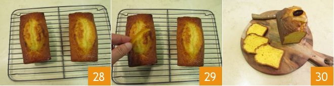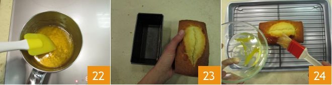 Pour the jam into a saucepan and bring it to a boil 22. Remove the pound cakes 23 and put them on a rack placed on a baking tray. Using a brush, brush the surface and the sides with lemon syrup 24.