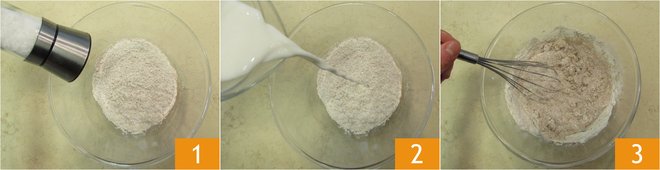 To make wholegrain crepes with mixed vegetables and feta, start by melting the butter for the batter, then leave it to cool. Place the wholegrain flour and the salt in a bowl 1, then gradually add the milk 2, stirring with a whisk all the while 3.