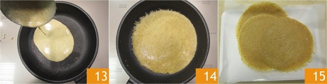 Remove the batter from the refrigerator and start cooking the crespelle: heat an 8" diameter non-stick pan and grease with a little butter, then pour in a ladle of batter in the middle of the pan 13. Cook on a medium-low flame for around 3 minutes 14, then turn the crepe over and cook for a couple of minutes on the other side too. Once cooked, pile them up on a tray 15; if you do not use your crepes right away then cover with plastic wrap or a cloth so that they do not become dry.