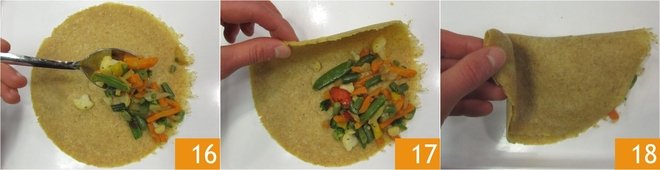 You are ready to assemble the crepes: cover a quarter of the surface with the filling 16, then fold in half 17 and lastly, into a triangle 18. Proceed to fill the other crepes in exactly the same way.