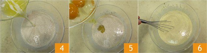 Add the melted and cooled butter 4, the eggs 5 and stir to amalgamate everything 6. Cover the bowl with plastic wrap and leave to rest in the refrigerator for 10 minutes.