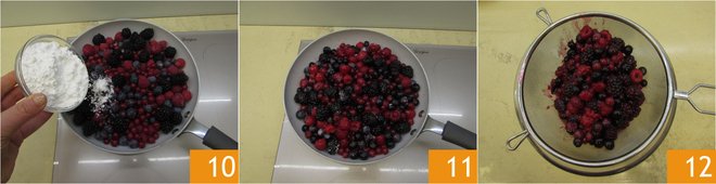 Now add the powdered sugar 10, stir and cook for around 5 minutes on a low flame; stir occasionally. Once the cooking time is up for the fruit, remove from the heat 11, drain the wild berries in a colander, leave them to cool and place a bowl under the colander to collect the juice 12. You'll use the wild berries for the filling, and the juice for the topping.