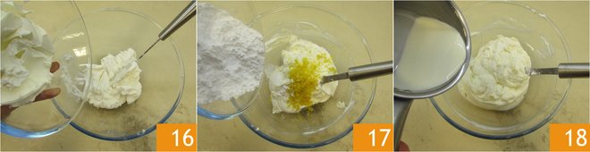 Now add the fresh spreadable cheese 16, the grated lemon peel and the powdered sugar 17; stir with a spatula or a whisk to amalgamate the cream, add the milk (in which you melted the gelatin), which will have cooled to lukewarm by now 18; stir until smooth.