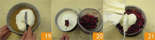 Remove the mold from the refrigerator, the base will be nice and firm by now. Pour half of the creamy mixture over the cookie base. Smooth the surface with a spatula 19 and then add the previously drained wild berries 20. Cover the layer of fruit with the remaining cream 21,