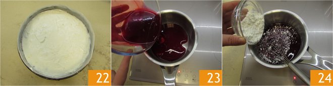 smooth the surface with a spatula 22 and leave in the refrigerator to firm up for 2 hours. Once the cheesecake is nice and cold, prepare the topping: pour 10 oz of the wild berry juice you left to one side in a saucepan 23 and add the sieved cornstarch 24. Stir with a whisk to prevent lumps from forming, place the saucepan on the stove and slowly thicken on a low flame for around 5 minutes, then leave to cool; stir frequently.
