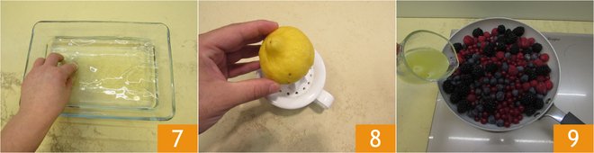 Prepare the filling in the meantime: soak the isinglass in a large bowl with cold water 7 for around 10 minutes, until soft (it will make the cream firmer). Squeeze and filter the juice of the lemon 8. Wash and pat the wild berries dry, place them in a large pan and add the lemon juice 9.
