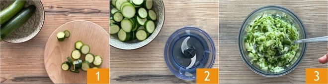 To prepare zucchini and speck croquettes, first wash and trim the zucchini, then roughly slice them into rounds 1. Transfer the zucchini into a mixer 2 and chop them, taking care not to make a puree 3.