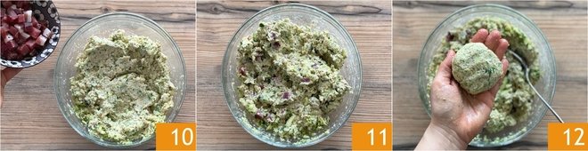Mix again and finally add the speck 10. Work everything with a spoon to obtain a soft and consistent dough 11. Oil your palms with olive oil and form slightly flattened balls 12; with these quantities, you will obtain about 12 croquettes.