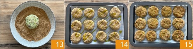 Coat the croquettes with breadcrumbs 13 and place them on a baking sheet lined with parchment paper. Drizzle with a bit of oil 14 and bake in a preheated fan oven at 180°C (350°F) for about 30 minutes. When they are nicely golden, take them out of the oven and serve your zucchini and speck croquettes 15!
