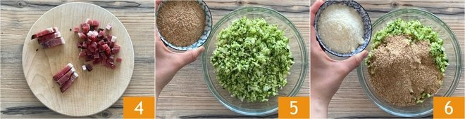Cut the speck into cubes 4. Pour the chopped zucchini into a bowl and add the breadcrumbs 5 and grated Parmesan cheese 6.