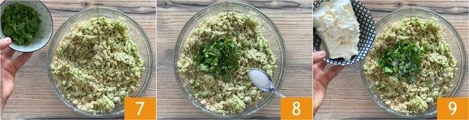 Mix to combine, then add the parsley 7, salt 8, and robiola cheese 9.