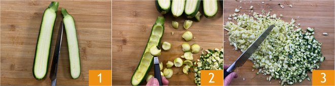 To prepare the zucchini stuffed with ricotta cut a layer lengthwise so as to reveal the pulp 1 keeping the stalk, dig the inside 2 and chop both the pulp and the waste of the peel with a knife 3.