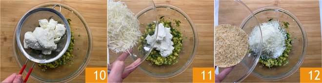 Add the well-drained ricotta 10, the grated Pecorino 11 and the breadcrumbs 12.