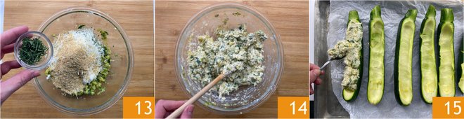 Season with thyme 13, a pinch of salt and mix until the mixture is homogeneous 14. Take the zucchini and dru the inside in case they have released some water. Fill them with the ricotta mixture 15, pressing them lightly to obtain a rounded surface.