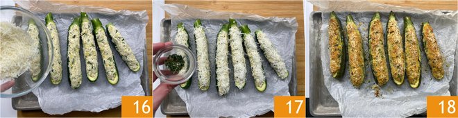 Sprinkle with more Pecorino 16, thyme 17, a drizzle of oil, and cook in a preheated conventional oven at 390°F (200°C) for 40 minutes, then grill them for 2 minutes, just enough time to brown them. Your zucchini stuffed with ricotta are ready to be served 18.