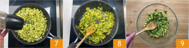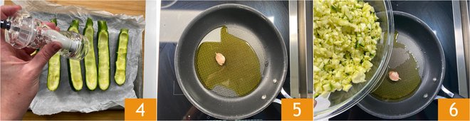 Salt the inside of the zucchini 4 and set them aside. In a pan, heat the oil with a garlic clove 5, add the zucchini pulp 6,