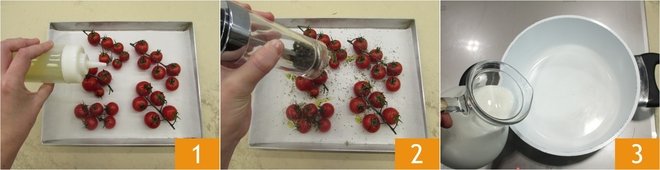 To make zucchini, tomato and sausage lasagna, start by preparing the tomatoes: wash the cherry tomatoes and place them whole on a tray lined with parchment paper. Season with oil 1, salt, brown sugar, the sprigs of thyme, dried oregano and pepper to taste 2. Bake in a ventilated oven preheated to 290°F (145°C) for around 120 minutes. In the meantime, prepare the béchamel: heat the milk in a saucepan 3, then add a pinch of salt and the nutmeg.