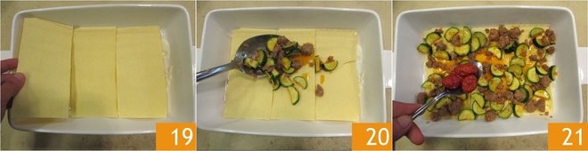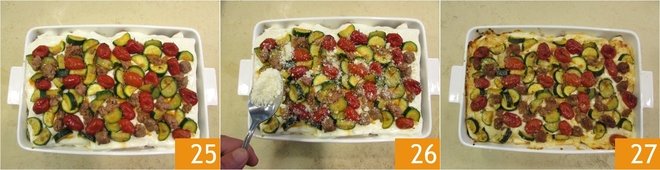 The last layer must consist of bechamel, zucchini and sausage sauce, tomatoes and Grana Padano 26. Bake in a ventilated oven preheated to 400°F (205°C) for 25 minutes. Once baked, remove the zucchini, tomato and sausage lasagna, and leave to cool slightly before serving 27.