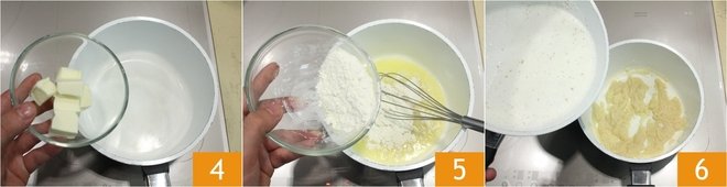 Separately, melt the butter on low heat 4, remove from the heat and add the flour in one go 5, beat with a whisk to avoid the formation of lumps. Return to low heat, stir until golden. Incorporate the hot milk 6 and cook for 5-6 minutes on low heat.