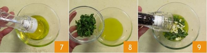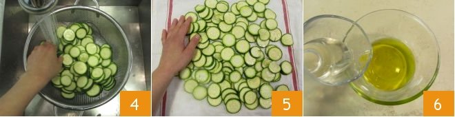 After 30 minutes, rinse the zucchini under running water 4, then leave them to dry thoroughly on a dish towel 5. Next, prepare the zucchini dressing: Pour the oil into a bowl, add the white wine vinegar 6,