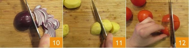 In the meantime, prepare the other ingredients: peel and slice the onion into fairly thick slices 10; wash and peel the potatoes, then cut them into pieces about 1 inch in size to prevent them from falling apart during cooking 11. Finally, wash and cut the tomatoes into pieces the same size as the potatoes 12. Mix all the vegetables in a bowl and set aside for now.