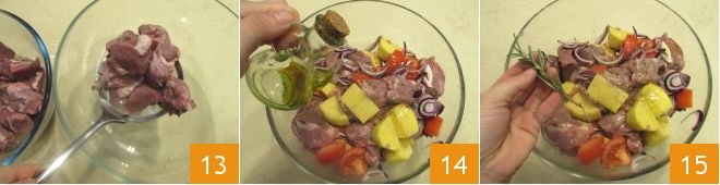 After the marinating time has elapsed, remove the lamb with a slotted spoon and transfer it to a larger bowl, thus eliminating the excess marinade 13. Add the prepared vegetable mix and season with the oil 14, rosemary 15, salt, and pepper, then mix well.