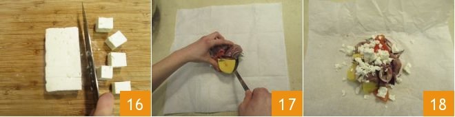 Finally, cut the feta into cubes 16 and cut 8 sheets of parchment paper measuring 13x14 inches. Place 4 sheets on the work surface and distribute the lamb and vegetable mix equally in the center of each one 17, then crumble the feta on top, dividing it among the 4 portions 18.