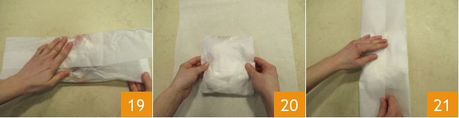 Now close the parchment paper sheet as if it were a gift package by folding the top and bottom flaps towards the center to cover the content 19, and do the same with the two side flaps. Place the package thus obtained in the center of another sheet of parchment paper 20 and close it the same way by folding the flaps towards the center 21.