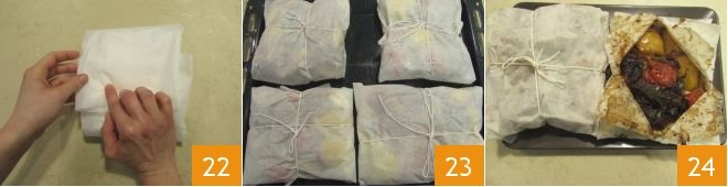 Once you've obtained another package 22, tie it with kitchen string, securing it in the middle with a knot, and place the parcels on a baking sheet 23. Bake in a preheated static oven at 300°F for about 4 hours, after which your lamb kleftiko will be ready to be served hot 24... once you open the foil, mix the contents to blend all the flavors well!