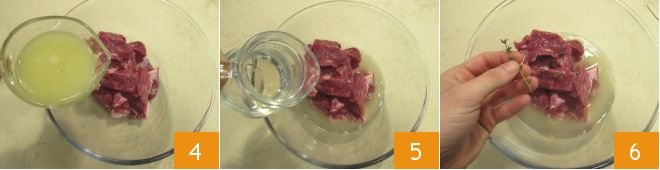 Transfer the meat cubes into a bowl and add the lemon juice 4, the white wine 5, the thyme leaves 6,