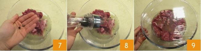the juniper berries 7 and a grind of pepper 8, then mix well, cover with plastic wrap 9 and place the bowl in the refrigerator to marinate for about 30 minutes.