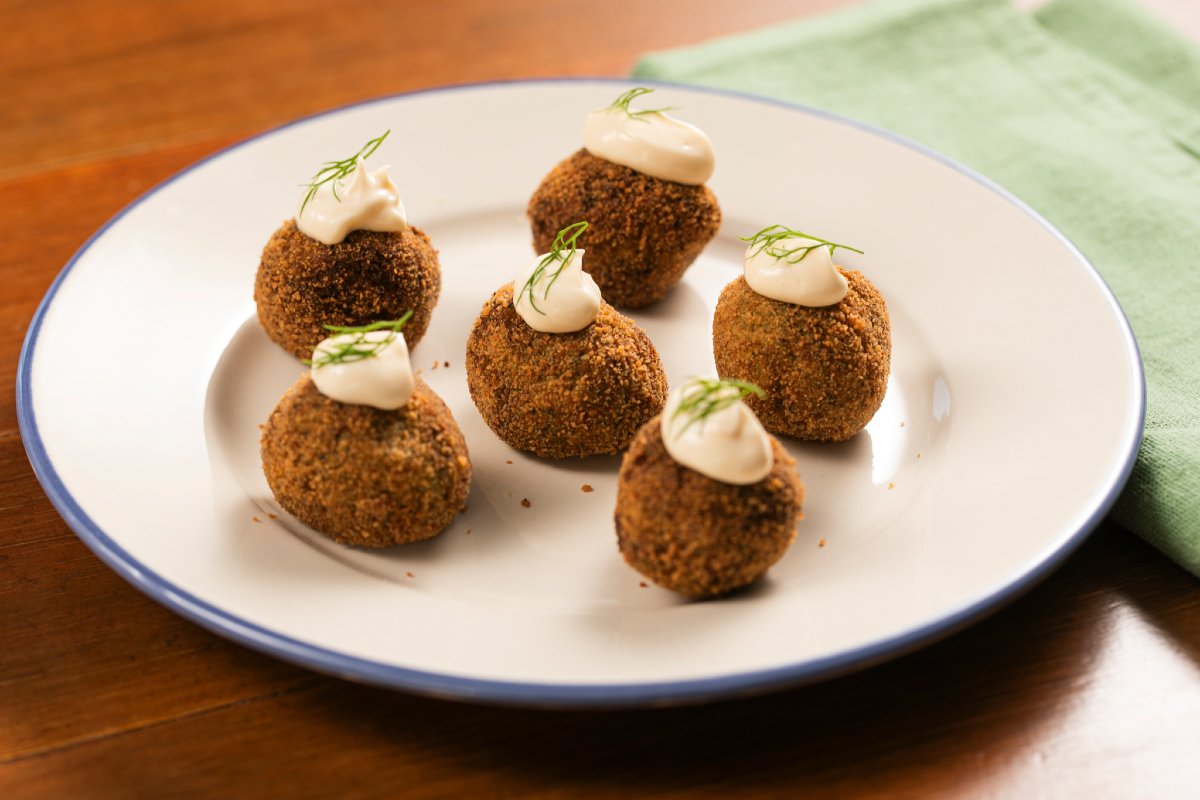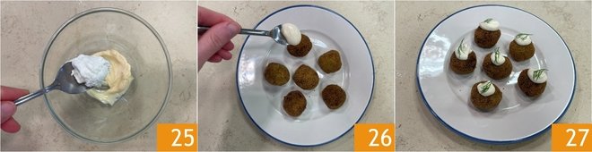 Meanwhile prepare the sauce by mixing the mayonnaise with the horseradish 25. Garnish each ball with a dollop of sauce 26 and a fennel frond. Your agretti, asparagus and zucchini balls are ready to be served 27!