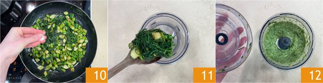 Sauté over medium heat for about 10 minutes, seasoning with salt 10 and pepper. Once the vegetables are cooked, remove the garlic and transfer them to a food processor 11. Blend until smooth and creamy 12.