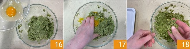 Add the egg 16 and a pinch of salt, then mix with your hands to combine the mixture 17. If it turns out too soft, you can adjust the texture with more breadcrumbs or grated cheese. Take about 25 g (about 1 oz) of mixture at a time 18.