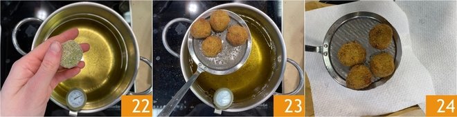 At this point, heat the vegetable oil to 356°F. Immerse a few balls at a time 22 and fry for 2–3 minutes. When they are nicely golden, drain 23 on paper towels 24.
