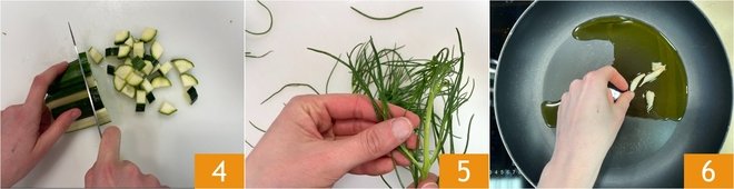 Trim the zucchini and cut them into cubes 4. Finally, remove the toughest stems from the agretti 5. In a nonstick pan, heat a drizzle of oil with the garlic to flavor it 6.