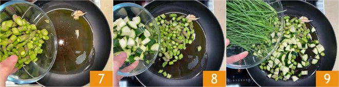 Add the asparagus 7, the zucchini 8 and the agretti 9.