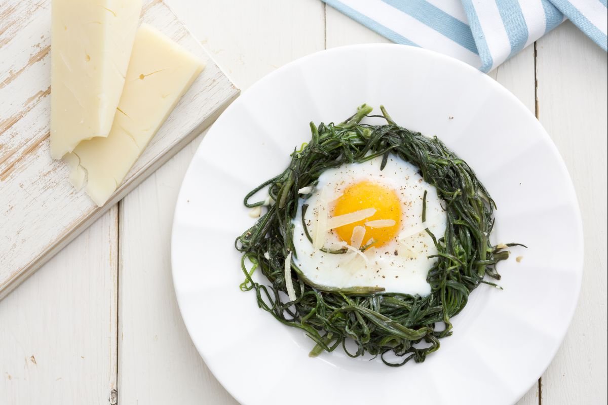 At the end of cooking 10, add the remaining cheese on top 11 and adjust with salt and pepper: your agretti nests are ready to be served hot 12!