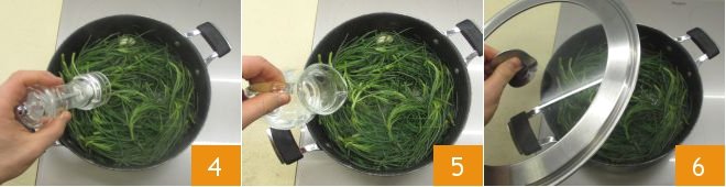 Season with salt 4, pour water into the pan 5, cover with a lid 6, and cook for 10 minutes on medium heat. Once the agretti are cooked, remove the garlic and let them cool slightly.