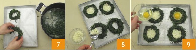 Now shape the agretti to form 4 rings on a baking sheet lined with parchment paper 7. Grate the provolone with a coarse grater and distribute it inside the nests 8, keeping some aside for the final garnish. Finally, add a whole egg to each nest, pouring it gently in the center 9. Bake in a preheated static oven at 375°F for about 10 minutes.