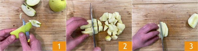 To prepare the air fryer apple cake, first peel the apples 1, then cut half into 5/8-inch (1.5 cm) cubes 2 and half into slices about 3/8-inch (1 cm) thick 3.