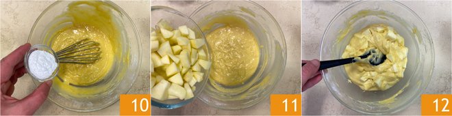 Also add the sifted baking powder 10. Finally, fold in the apple cubes 11 and mix carefully with a spatula 12.